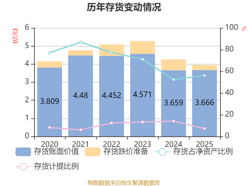 从存货变动来看,截至2025年末,公司存货账面价值为3.67亿元,占净资产的56.15%,较上年末增加68.84万元。其中,存货跌价准备为2849.94万元,计提比例为7.21%。
