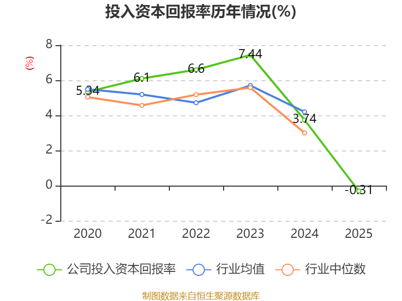 数据显示,2025年公司加权平均净资产收益率为-1.22%,较上年同期下降4.48个百分点。公司2025年投入资本回报率为-0.31%,较上年同期下降4.05个百分点。