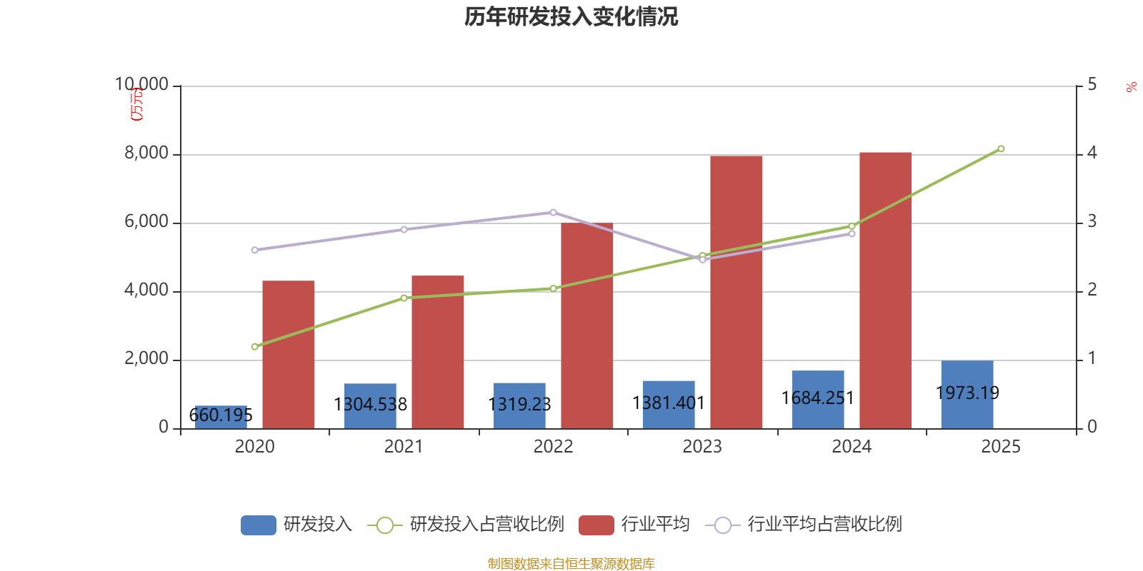 2025年全年,公司研发投入金额为1973.19万元,同比增长17.16%;研发投入占营业收入比例为4.08%,相比上年同期上升1.13个百分点。此外,公司全年研发投入资本化率为0%。