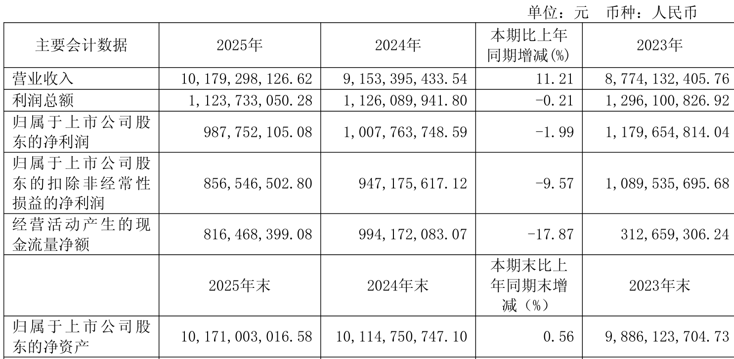 中证智能财讯嘉化能源(600273)4月10日披露2025年年度报告。2025年,公司实现营业总收入101.79亿元,同比增长11.21%;归母净利润9.88亿元,同比下降1.99%;扣非净利润8.57亿元,同比下降9.57%;经营活动产生的现金流量净额为8.16亿元,同比下降17.87%;报告期内,嘉化能源基本每股收益为0.74元,加权平均净资产收益率为9.66%。公司2025年度分配预案为:拟向全体股东每10股派现2.5元(含税)。