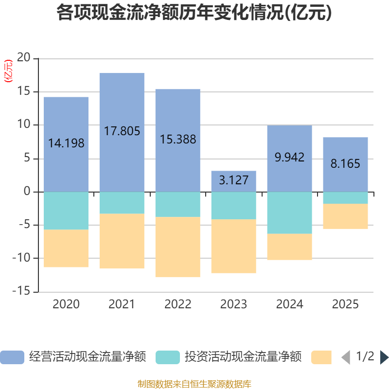 截至2025年,公司经营活动现金流净额为8.16亿元,同比下降17.87%;筹资活动现金流净额-3.78亿元,同比增加1502.09万元;投资活动现金流净额-1.8亿元,上年同期为-6.31亿元。