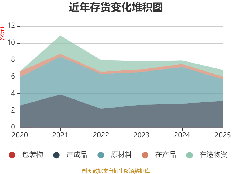 从存货变动来看,截至2025年末,公司存货账面价值为6.82亿元,占净资产的6.71%,较上年末减少1.11亿元。其中,存货跌价准备为5784.92万元,计提比例为7.82%。