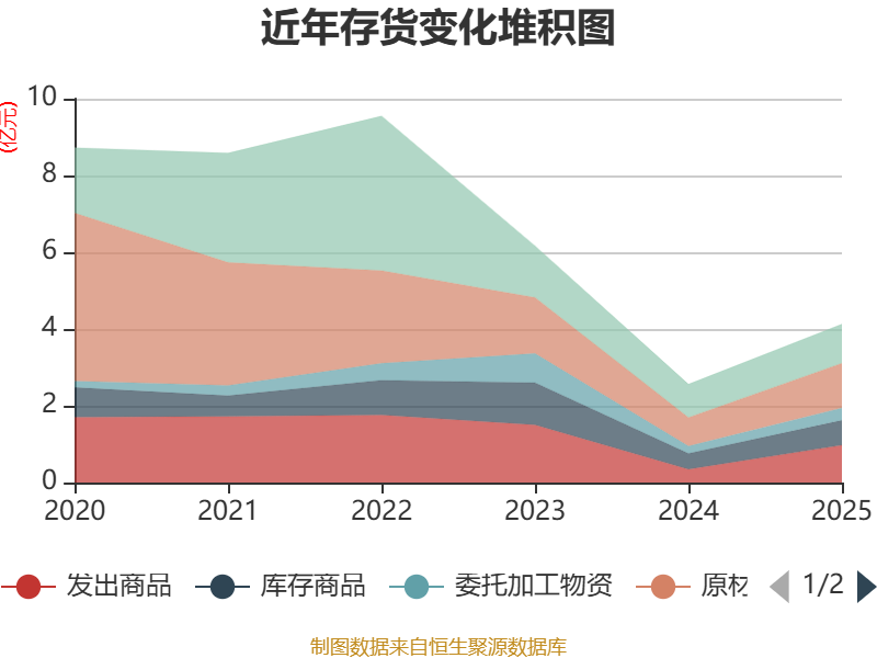 从存货变动来看,截至2025年末,公司存货账面价值为4.13亿元,占净资产的6.38%,较上年末增加1.56亿元。其中,存货跌价准备为1.34亿元,计提比例为24.48%。