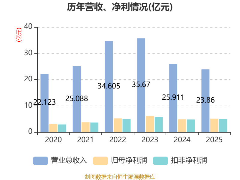 中证智能财讯国博电子(688375)4月10日披露2025年年度报告。2025年,公司实现营业总收入23.86亿元,同比下降7.92%;归母净利润5.08亿元,同比增长4.72%;扣非净利润4.93亿元,同比增长3.50%;经营活动产生的现金流量净额为8.89亿元,同比增长226.99%;报告期内,国博电子基本每股收益为0.85元,加权平均净资产收益率为8.02%。公司2025年度分配预案为:拟向全体股东每10股派现4.26元(含税)。