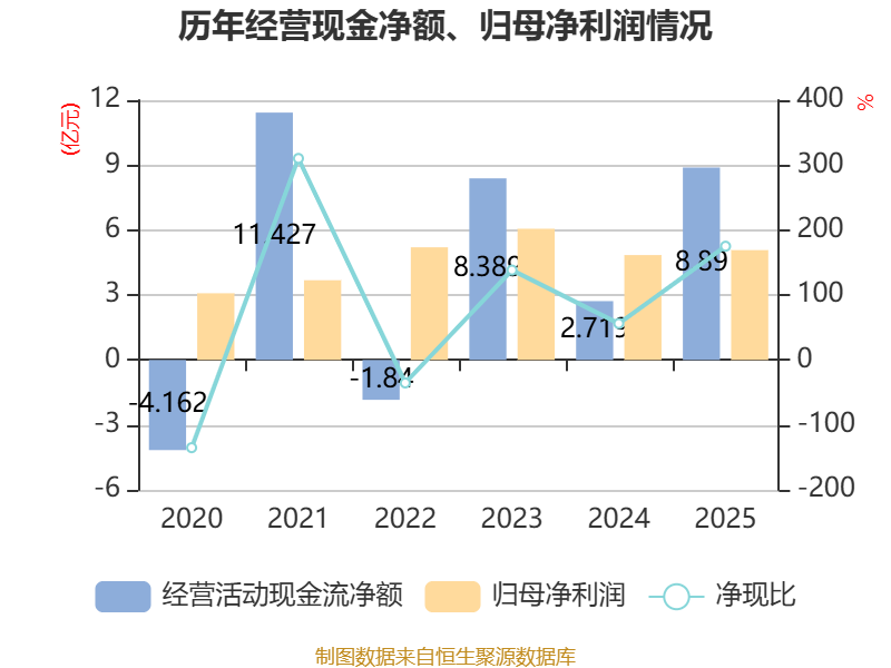 截至2025年,公司经营活动现金流净额为8.89亿元,同比增长226.99%;筹资活动现金流净额-2.79亿元,同比增加7061.41万元;投资活动现金流净额-4.92亿元,上年同期为6921.36万元。