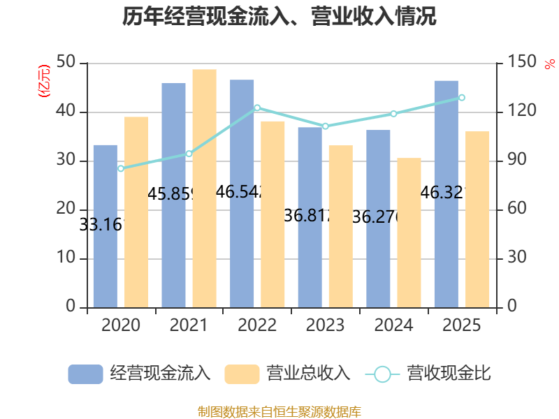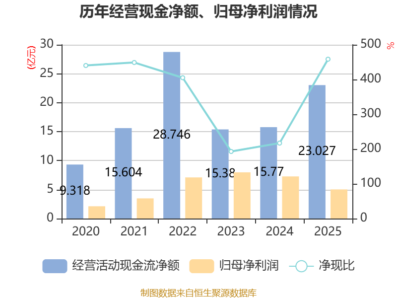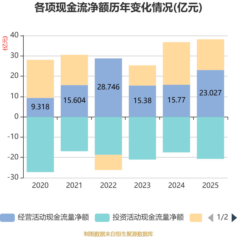 截至2025年,公司经营活动现金流净额为23.03亿元,同比增长46.01%;筹资活动现金流净额15.12亿元,同比减少5.85亿元;投资活动现金流净额-20.72亿元,上年同期为-17.52亿元。