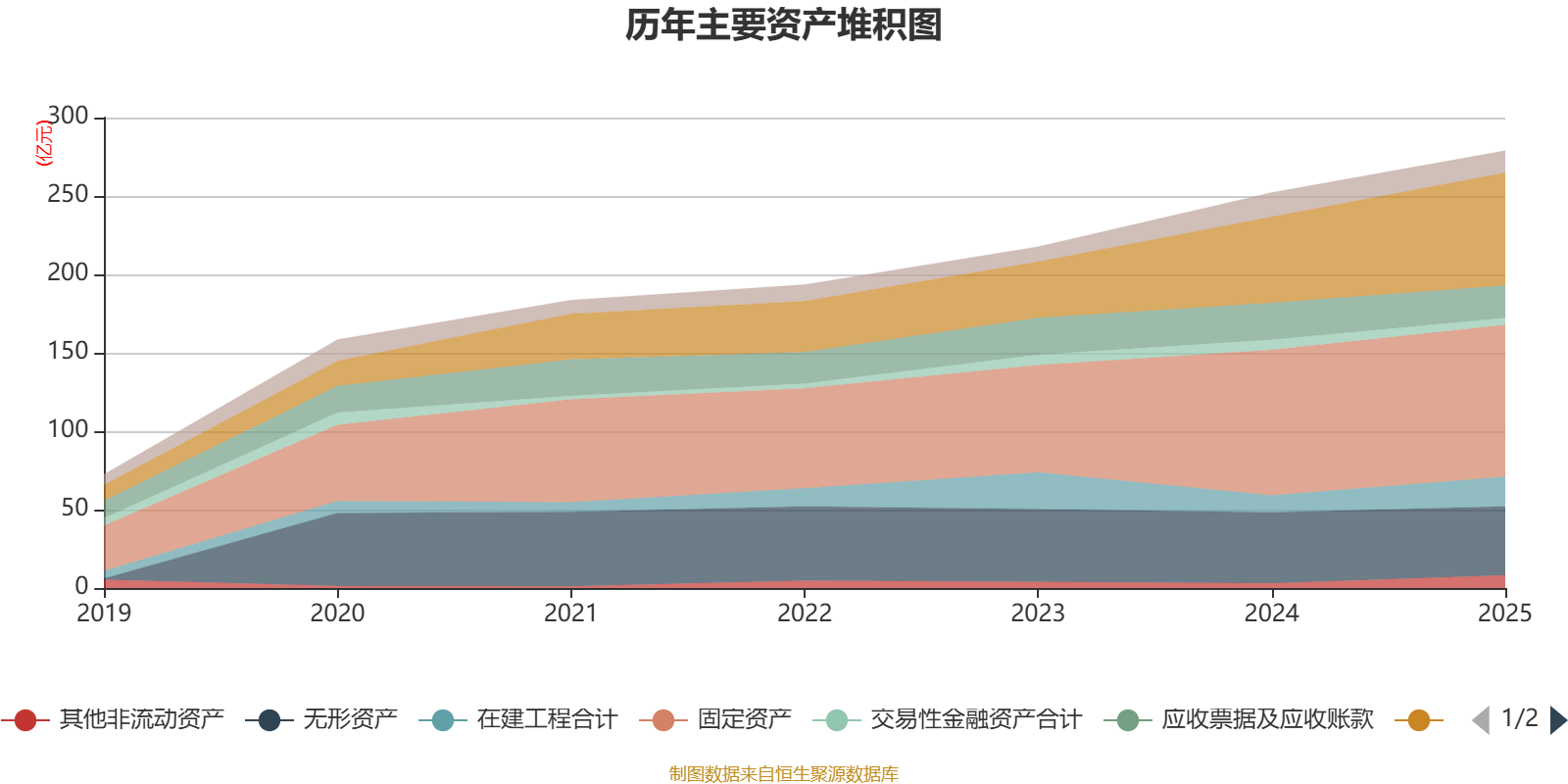资产重大变化方面,截至2025年末,公司货币资金较上年末增加31.07%,占公司总资产比重上升4.03个百分点;在建工程合计较上年末增加75.49%,占公司总资产比重上升2.52个百分点;无形资产较上年末减少3.19%,占公司总资产比重下降2.23个百分点;固定资产较上年末增加4.34%,占公司总资产比重下降2.08个百分点。