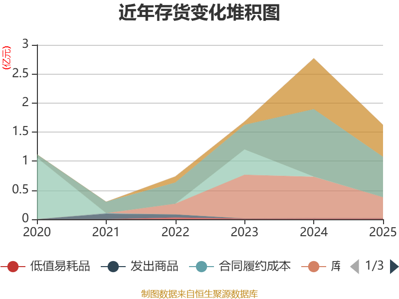 从存货变动来看,截至2025年末,公司存货账面价值为1.62亿元,占净资产的1.55%,较上年末减少1.15亿元。其中,存货跌价准备为66.13万元,计提比例为0.41%。