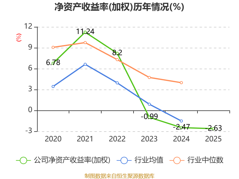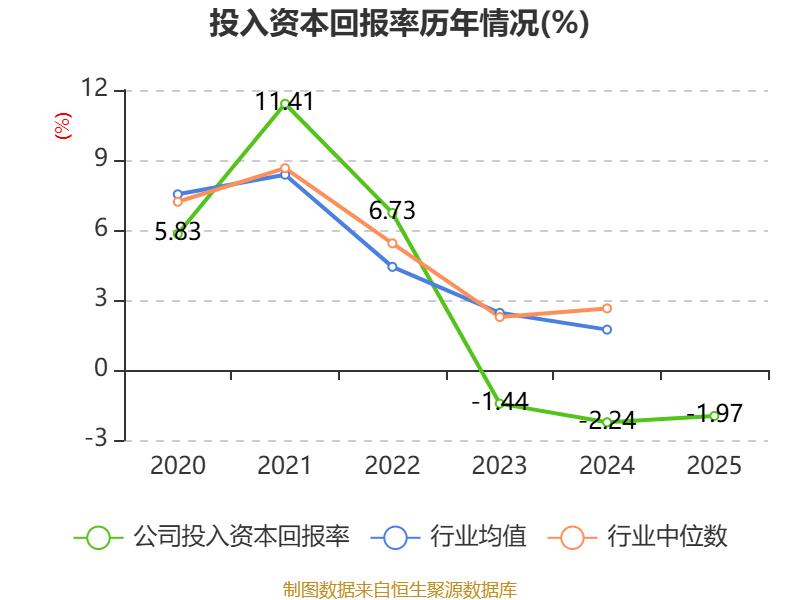 数据显示,2025年公司加权平均净资产收益率为-2.63%,较上年同期下降0.16个百分点。公司2025年投入资本回报率为-1.97%,较上年同期上升0.27个百分点。