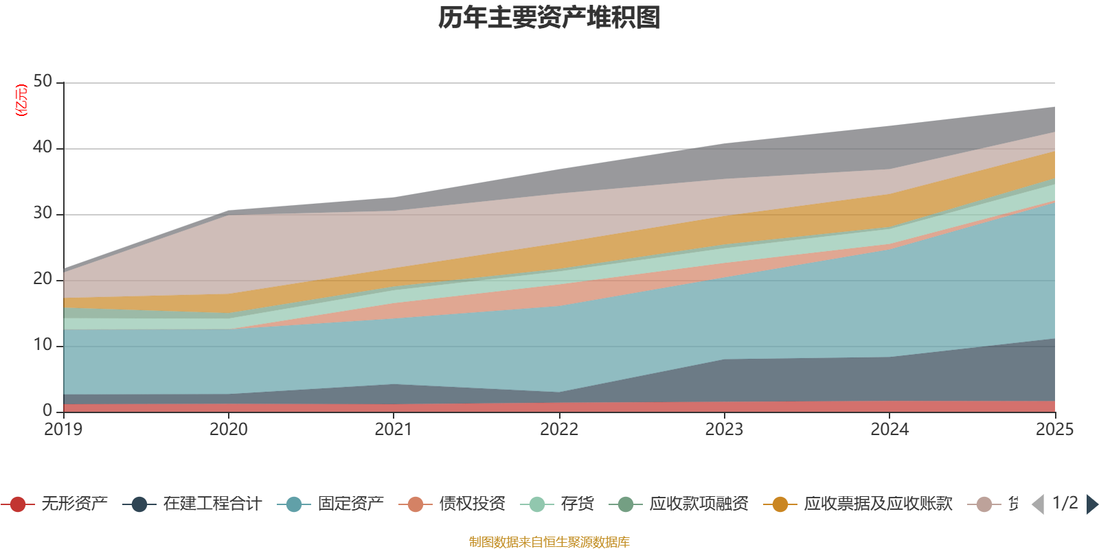 资产重大变化方面,截至2025年末,公司固定资产较上年末增加26.31%,占公司总资产比重上升6.92个百分点;在建工程合计较上年末增加43.11%,占公司总资产比重上升5.23个百分点;其他非流动资产较上年末减少76.89%,占公司总资产比重下降3.17个百分点;应收票据及应收账款较上年末减少17.92%,占公司总资产比重下降2.66个百分点。