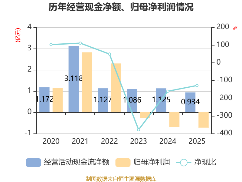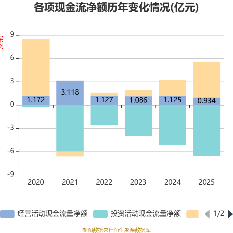 截至2025年,公司经营活动现金流净额为9340.38万元,同比下降16.94%;筹资活动现金流净额4.58亿元,同比增加2.51亿元;投资活动现金流净额-6.58亿元,上年同期为-5.2亿元。