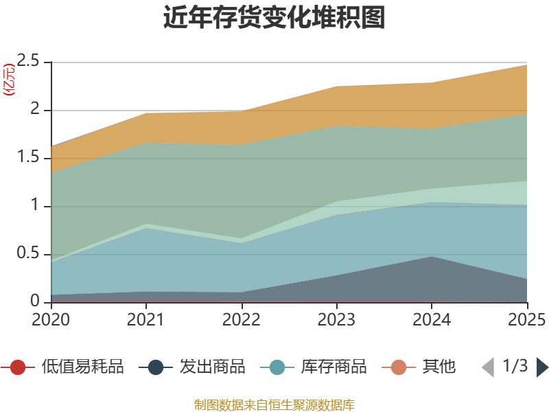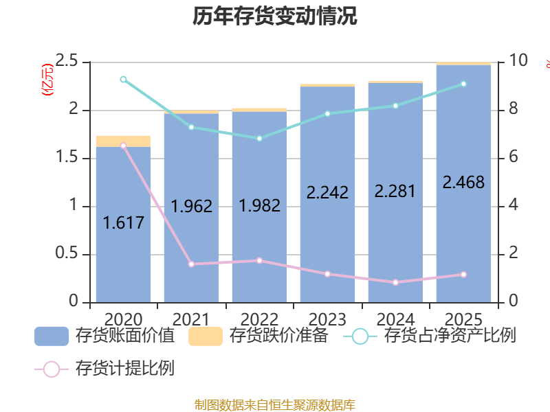 从存货变动来看,截至2025年末,公司存货账面价值为2.47亿元,占净资产的9.08%,较上年末增加1867.84万元。其中,存货跌价准备为287.36万元,计提比例为1.15%。