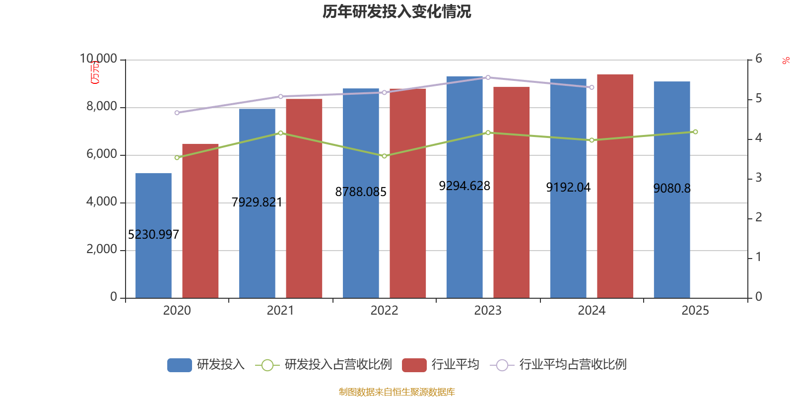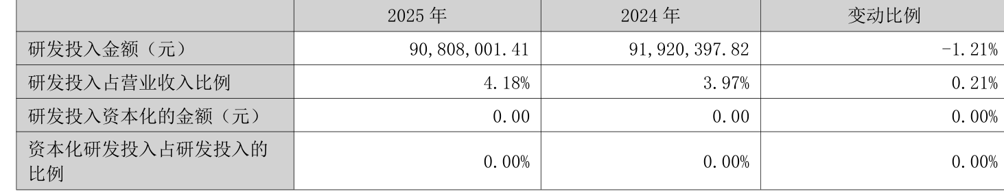 2025年全年,公司研发投入金额为9080.8万元,同比下降1.21%;研发投入占营业收入比例为4.18%,相比上年同期上升0.21个百分点。此外,公司全年研发投入资本化率为0%。