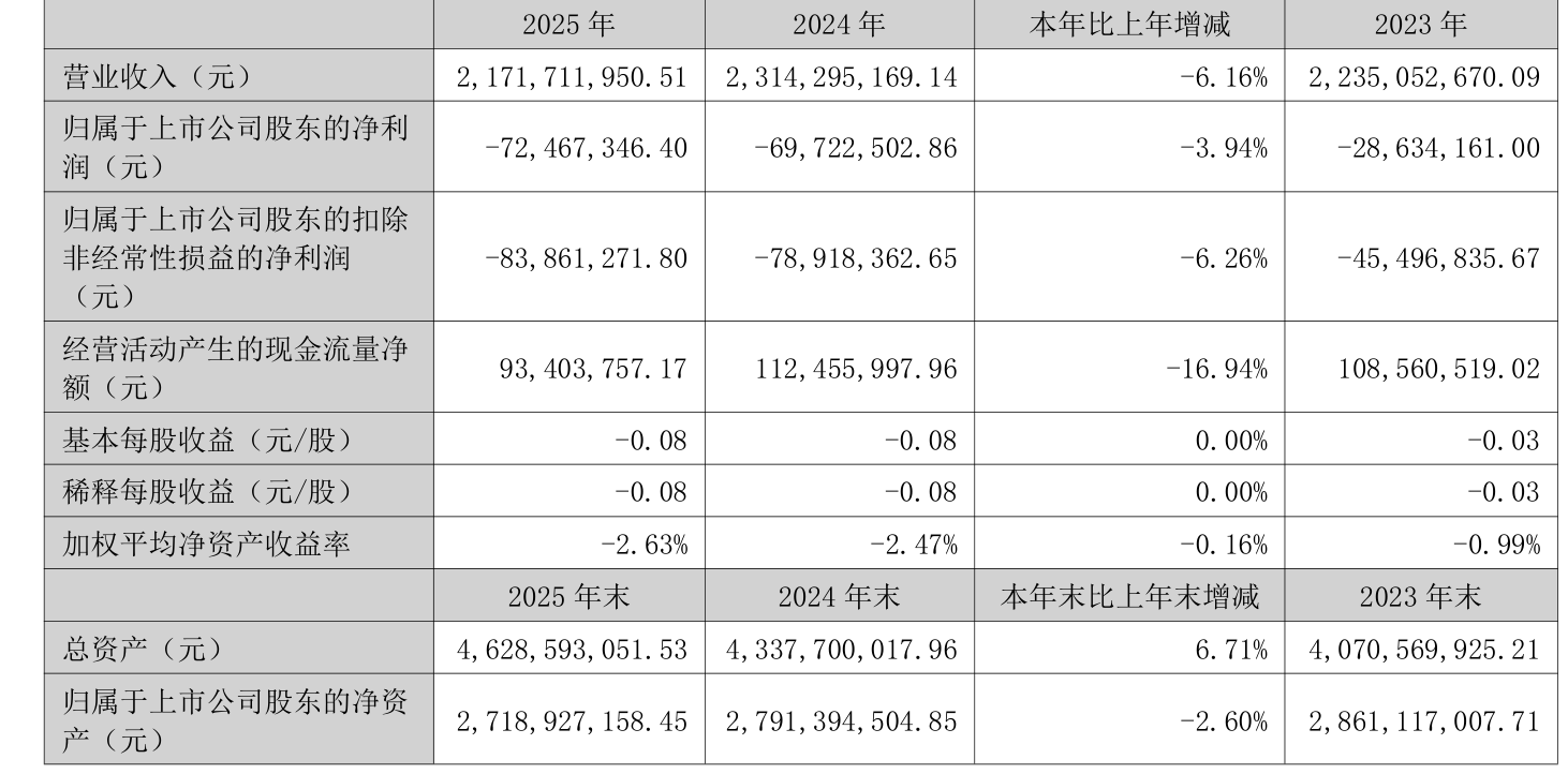 中证智能财讯国风新材(000859)4月10日披露2025年年度报告。2025年,公司实现营业总收入21.72亿元,同比下降6.16%;归母净利润亏损7246.73万元,上年同期亏损6972.25万元;扣非净利润亏损8386.13万元,上年同期亏损7891.84万元;经营活动产生的现金流量净额为9340.38万元,同比下降16.94%;报告期内,国风新材基本每股收益为-0.08元,加权平均净资产收益率为-2.63%。