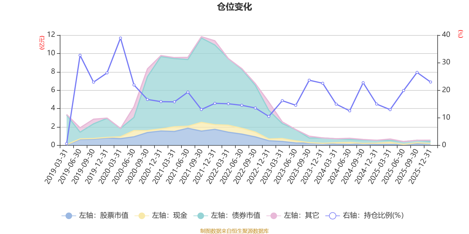 据定期报告数据统计,近三年平均股票仓位为18.67%,同类平均为72.57%。2020年一季度末基金达到38.93%的最高仓位,2019年一季度末最低,为0.58%。