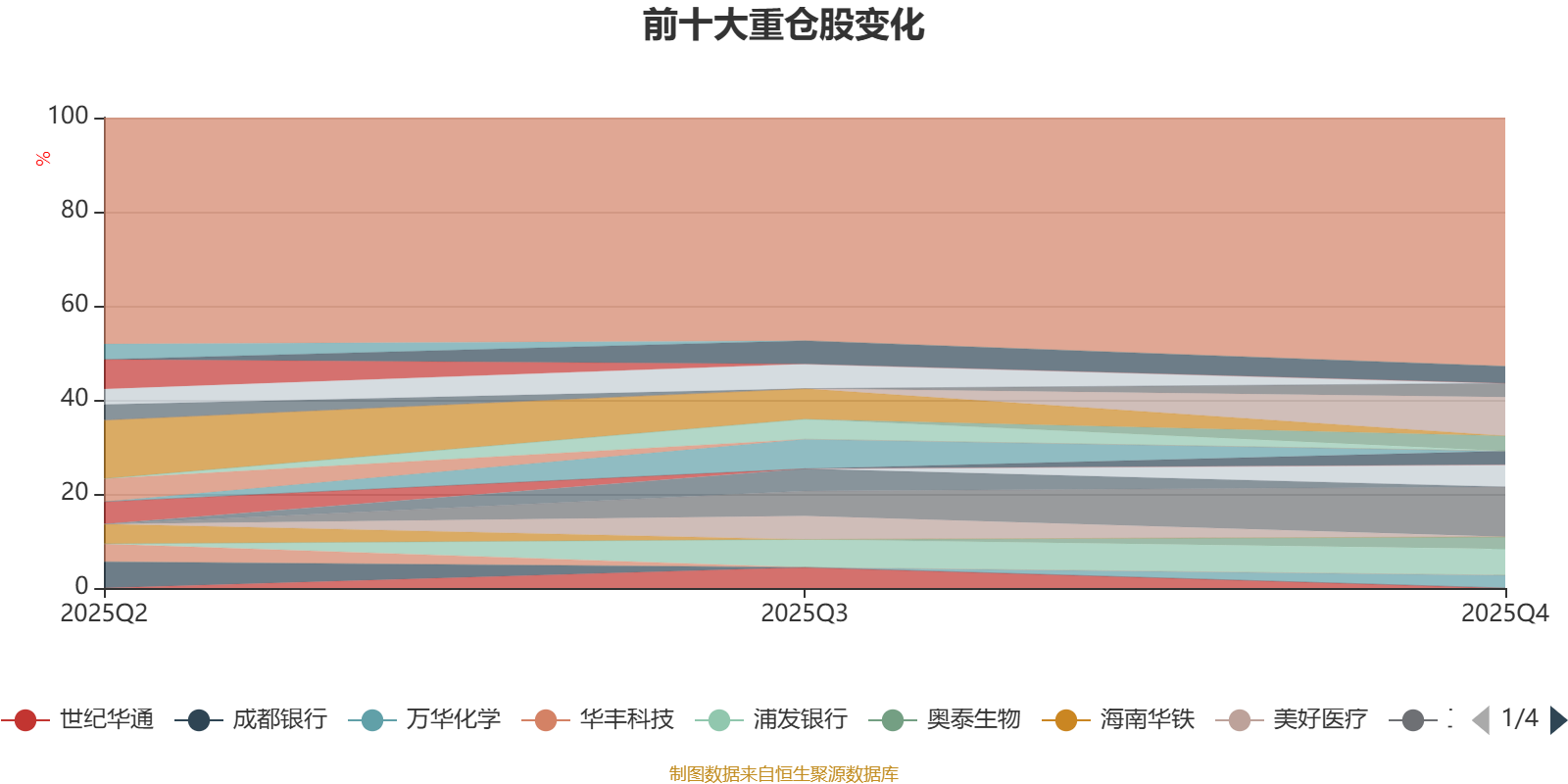 截至2025年末,基金十大重仓股分别是工商银行、长江电力、浦发银行、聚和材料、顺丰控股、华翔股份、中矿资源、索通发展、万华化学、奥泰生物。