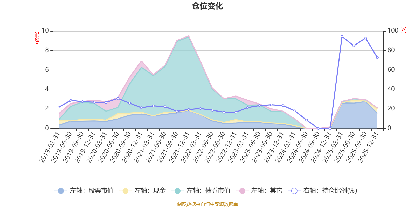 据定期报告数据统计,近三年平均股票仓位为38.69%,同类平均为72.57%。2025年一季度末基金达到94.39%的最高仓位,2024年上半年末最低,为8.6%。