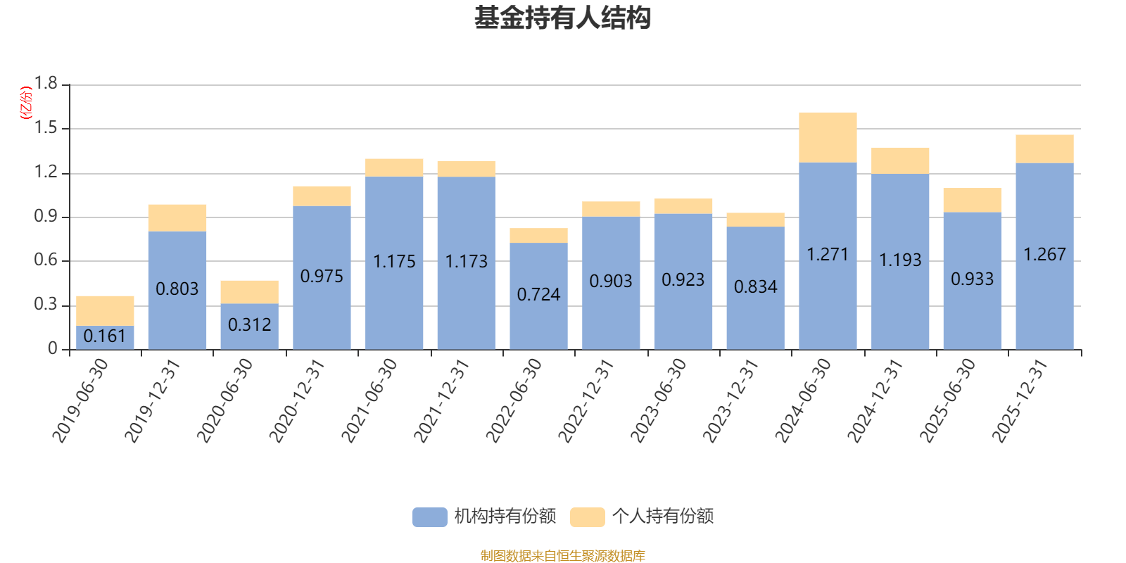 截至2025年12月31日,基金持有人共计1.43万户,合计持有1.46亿份。其中管理人员工持有6.28万份,占比0.04%,机构持有份额占比86.92%,个人投资者占比13.08%。