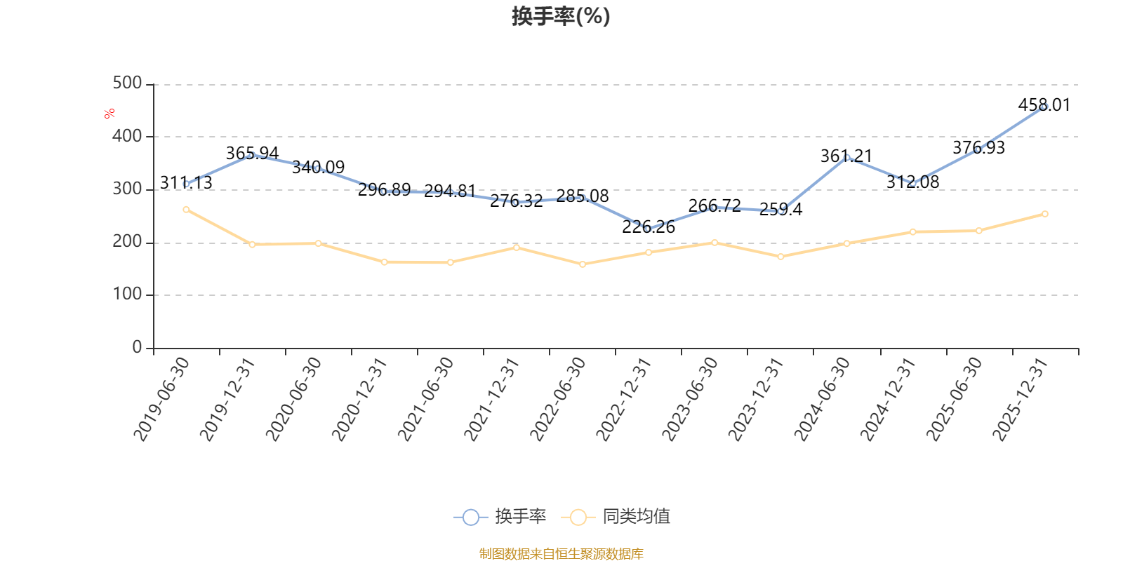 截至2025年12月31日,基金最近一年换手率约804.99%,持续高于同类均值。