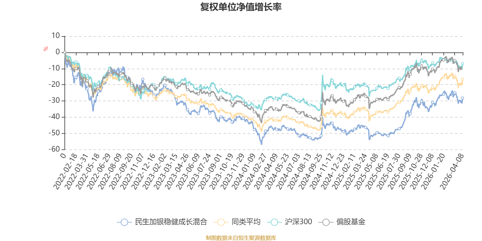 截至4月8日,民生加银稳健成长混合近三个月复权单位净值增长率为-1.81%,位于同类可比基金430/689;近半年复权单位净值增长率为0.19%,位于同类可比基金427/689;近一年复权单位净值增长率为56.32%,位于同类可比基金182/685;近三年复权单位净值增长率为2.62%,位于同类可比基金266/417。
