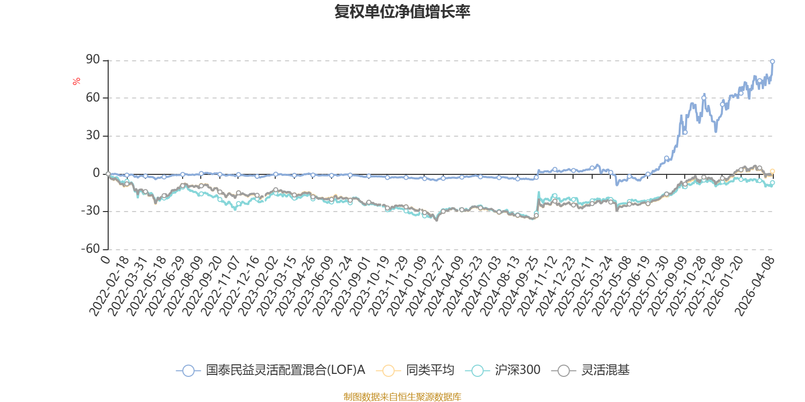 截至4月8日,国泰民益灵活配置混合(LOF)A近三个月复权单位净值增长率为17.19%,位于同类可比基金34/1287;近半年复权单位净值增长率为22.70%,位于同类可比基金72/1286;近一年复权单位净值增长率为107.96%,位于同类可比基金62/1286;近三年复权单位净值增长率为89.51%,位于同类可比基金41/1286。