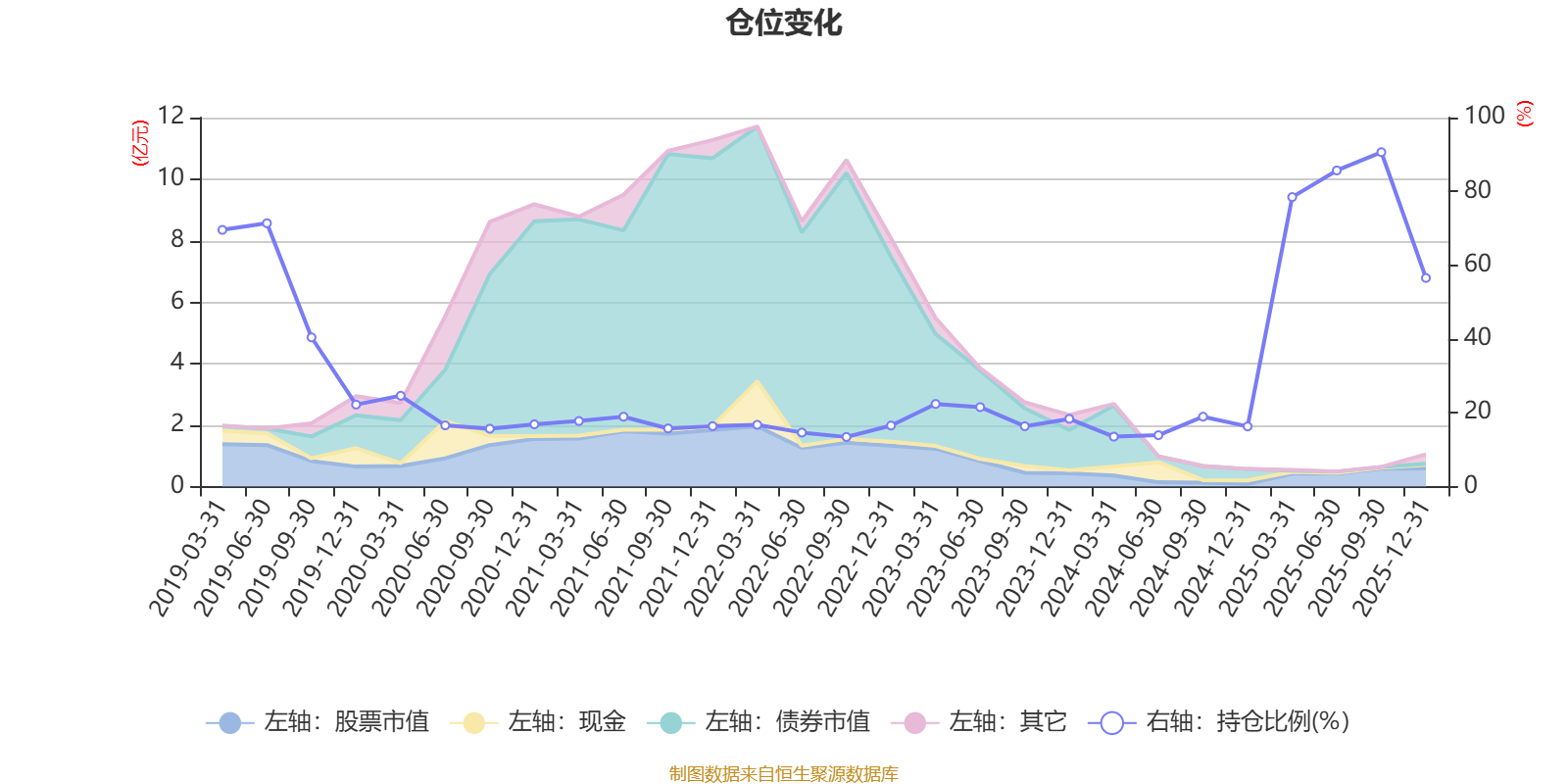 据定期报告数据统计,近三年平均股票仓位为37.72%,同类平均为72.57%。2025年三季度末基金达到90.63%的最高仓位,2022年三季度末最低,为13.45%。