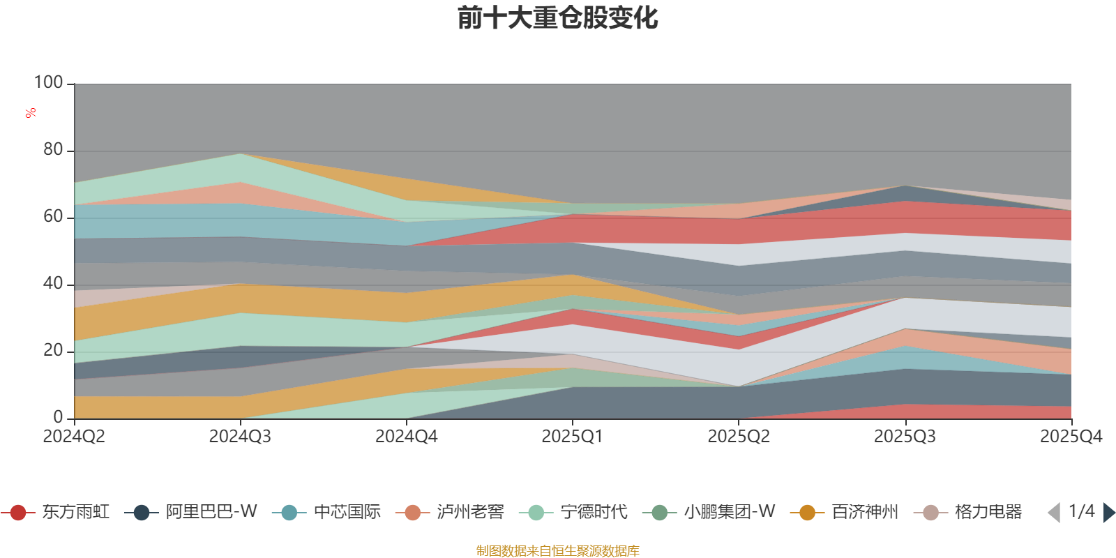 该基金持股集中度较高。截至2025年末,基金十大重仓股分别是阿里巴巴-W、小米集团-W、泡泡玛特、泸州老窖、美的集团、香港交易所、贵州茅台、东方雨虹、东鹏饮料、厦门象屿。