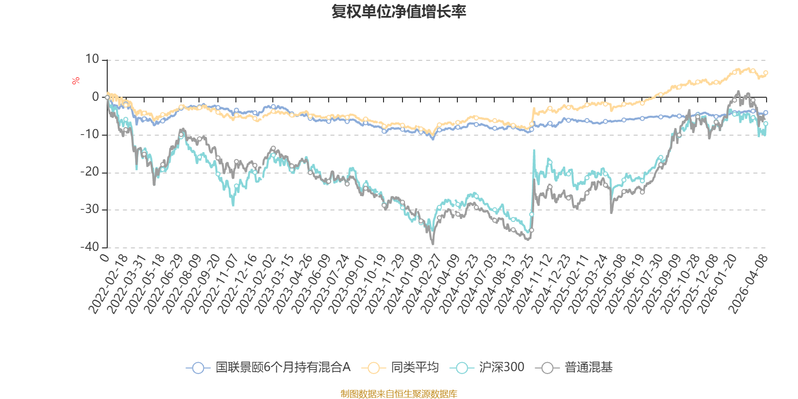 截至4月8日,国联景颐6个月持有混合A近三个月复权单位净值增长率为0.48%,位于同类可比基金308/629;近半年复权单位净值增长率为1.25%,位于同类可比基金335/629;近一年复权单位净值增长率为2.59%,位于同类可比基金577/629;近三年复权单位净值增长率为0.53%,位于同类可比基金534/581。