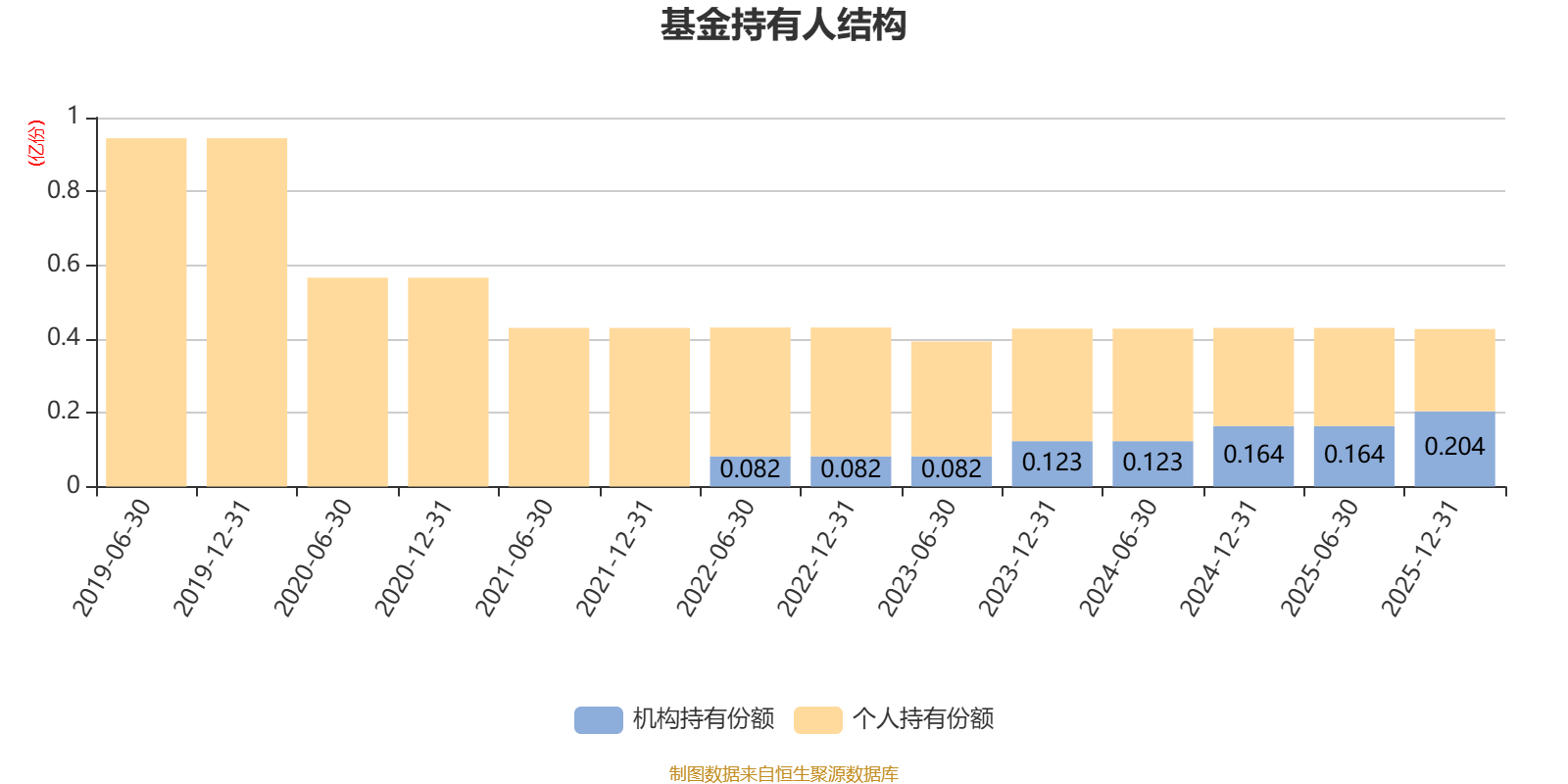 截至2025年12月31日,基金持有人共计2155户,合计持有4275.73万份。其中管理人员工持有100.09份,机构持有份额占比47.73%,个人投资者占比52.27%。