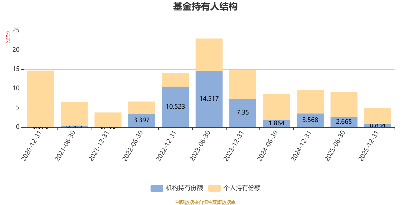 截至2025年12月31日,基金持有人共计6.03万户,合计持有4.99亿份。其中管理人员工持有108.62万份,占比0.22%,机构持有份额占比16.72%,个人投资者占比83.28%。
