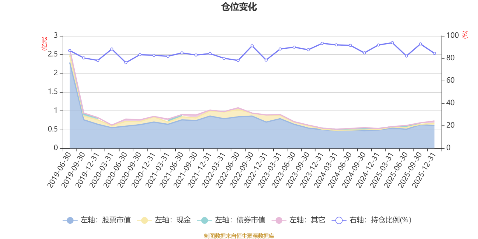 据定期报告数据统计,近三年平均股票仓位为89.4%,同类平均为84.04%。2025年一季度末基金达到93.89%的最高仓位,2020年上半年末最低,为76.14%。