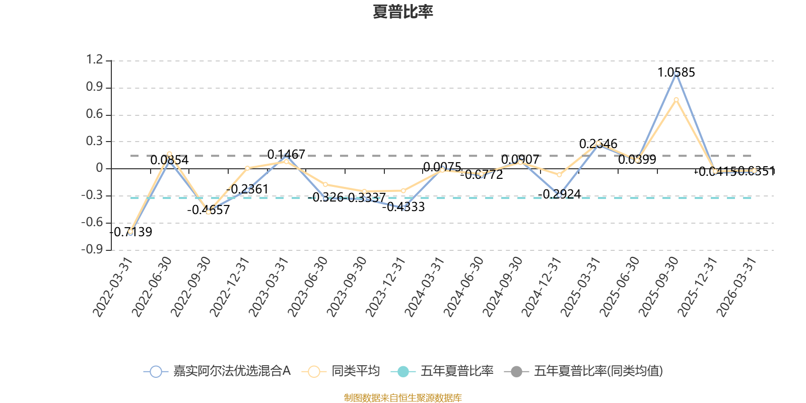 截至3月31日,基金近三年夏普比率为0.2577,位于同类可比基金146/178。