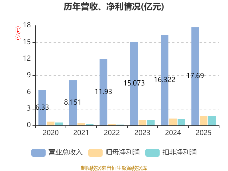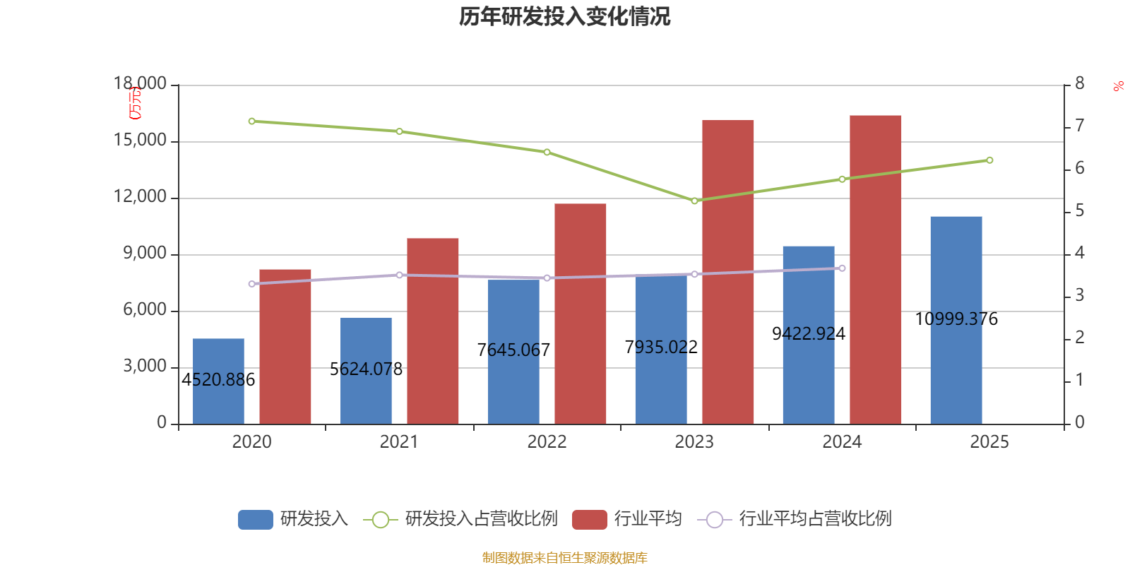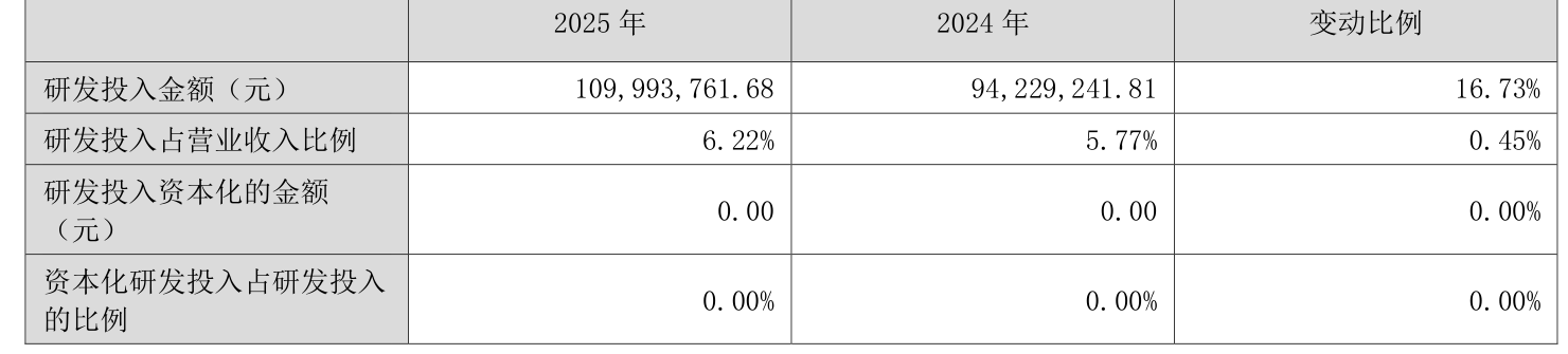 2025年全年,公司研发投入金额为1.1亿元,同比增长16.73%;研发投入占营业收入比例为6.22%,相比上年同期上升0.45个百分点。此外,公司全年研发投入资本化率为0%。
