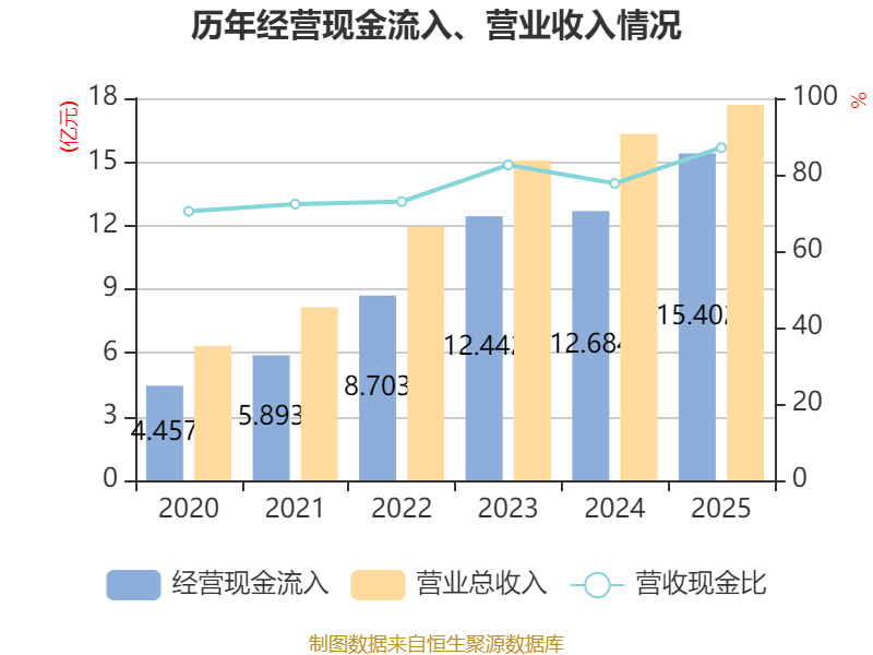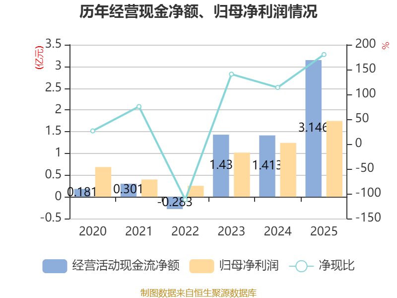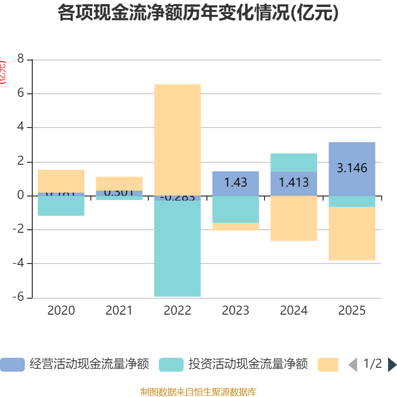 截至2025年,公司经营活动现金流净额为3.15亿元,同比增长122.59%;筹资活动现金流净额-3.13亿元,同比减少4734.83万元;投资活动现金流净额-6682.74万元,上年同期为1.07亿元。