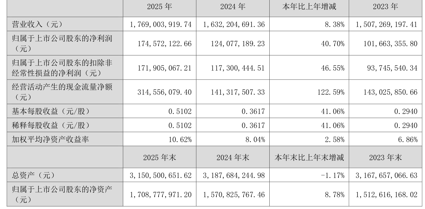 中证智能财讯金奥博(002917)4月10日披露2025年年度报告。2025年,公司实现营业总收入17.69亿元,同比增长8.38%;归母净利润1.75亿元,同比增长40.70%;扣非净利润1.72亿元,同比增长46.55%;经营活动产生的现金流量净额为3.15亿元,同比增长122.59%;报告期内,金奥博基本每股收益为0.5102元,加权平均净资产收益率为10.62%。公司2025年度分配预案为:拟向全体股东每10股派现1.5元(含税)。