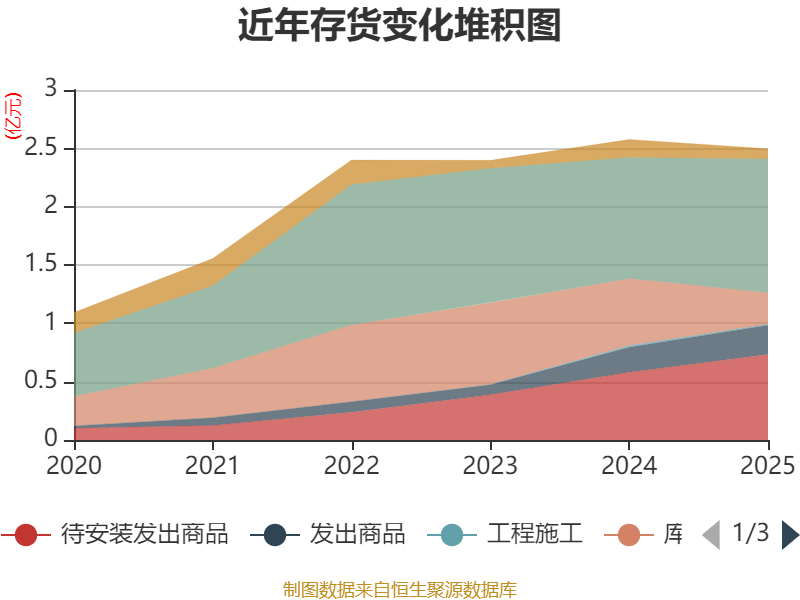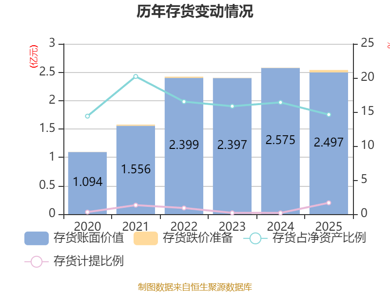 从存货变动来看,截至2025年末,公司存货账面价值为2.5亿元,占净资产的14.61%,较上年末减少781.65万元。其中,存货跌价准备为421.48万元,计提比例为1.66%。