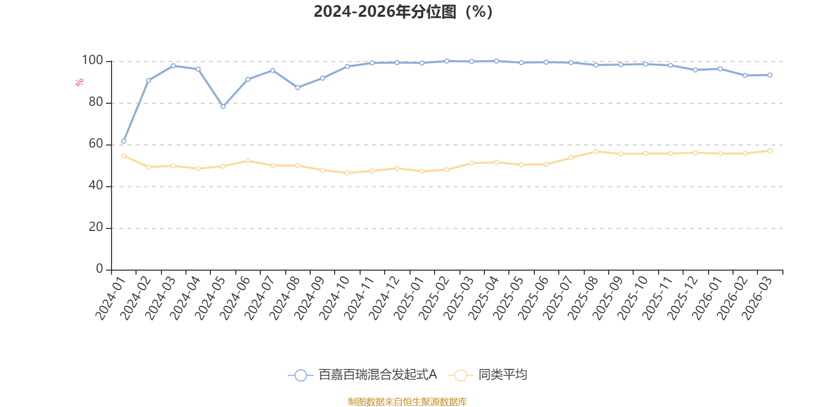 通过所选区间该基金净值增长率分位图,可以观察该基金与同类基金业绩比较情况。图为坐标原点到区间内某时点的净值增长率在同类基金中的分位数。