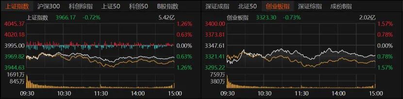 昨日大涨后,A股今日缩量走弱,沪指收跌0.72%报3966.17点,创业板指收跌0.73%报3323.3点,深证成指收跌0.33%。沪深300、上证50、科创50跌幅均不超过1%,北证50收跌1.62%。