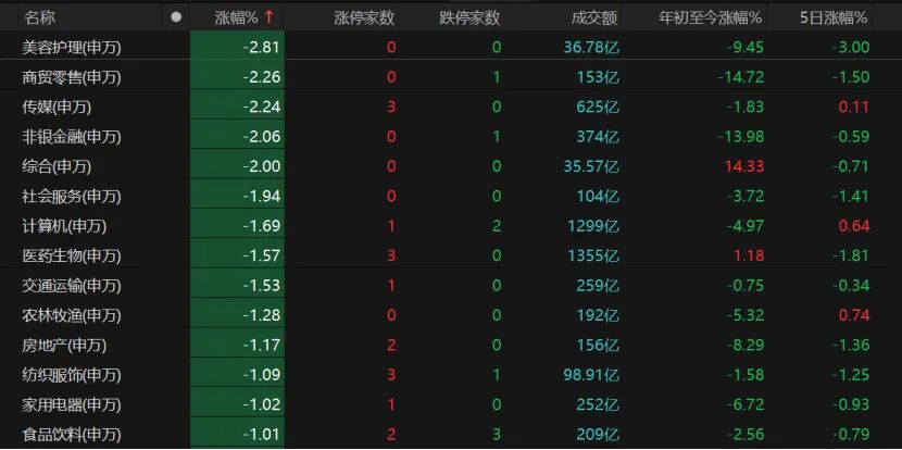大消费板块跌幅靠前,美容护理、商贸零售领跌,传媒、非银金融、社会服务、医药生物均收跌。