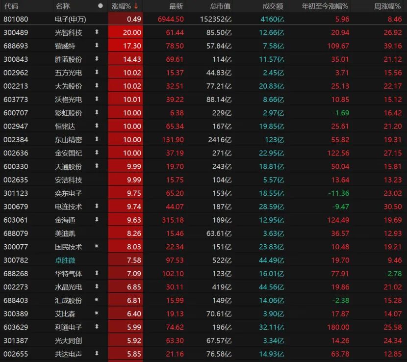 10只电子股涨停,光智科技“20cm”涨停,五方光电、大为股份、沃格光电、彩虹股份、恒铭达、东山精密等个股也涨停。
