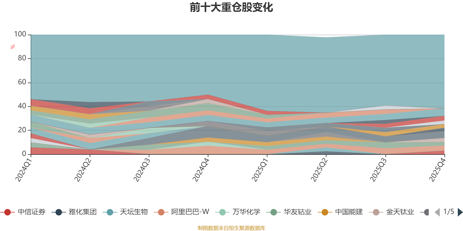 截至2025年末,基金十大重仓股分别是涪陵榨菜、昆仑能源、阿里巴巴-W、北京人力、金天钛业、伊利股份、太阳纸业、华友钴业、中信证券、洽洽食品。