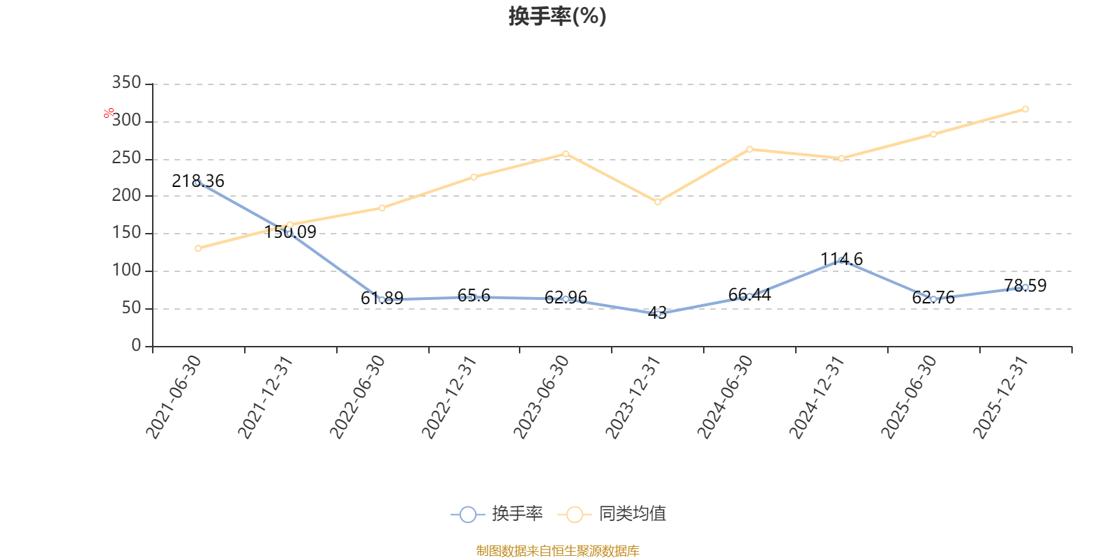 截至2025年12月31日,基金最近一年换手率约144.01%,持续4年低于同类均值。