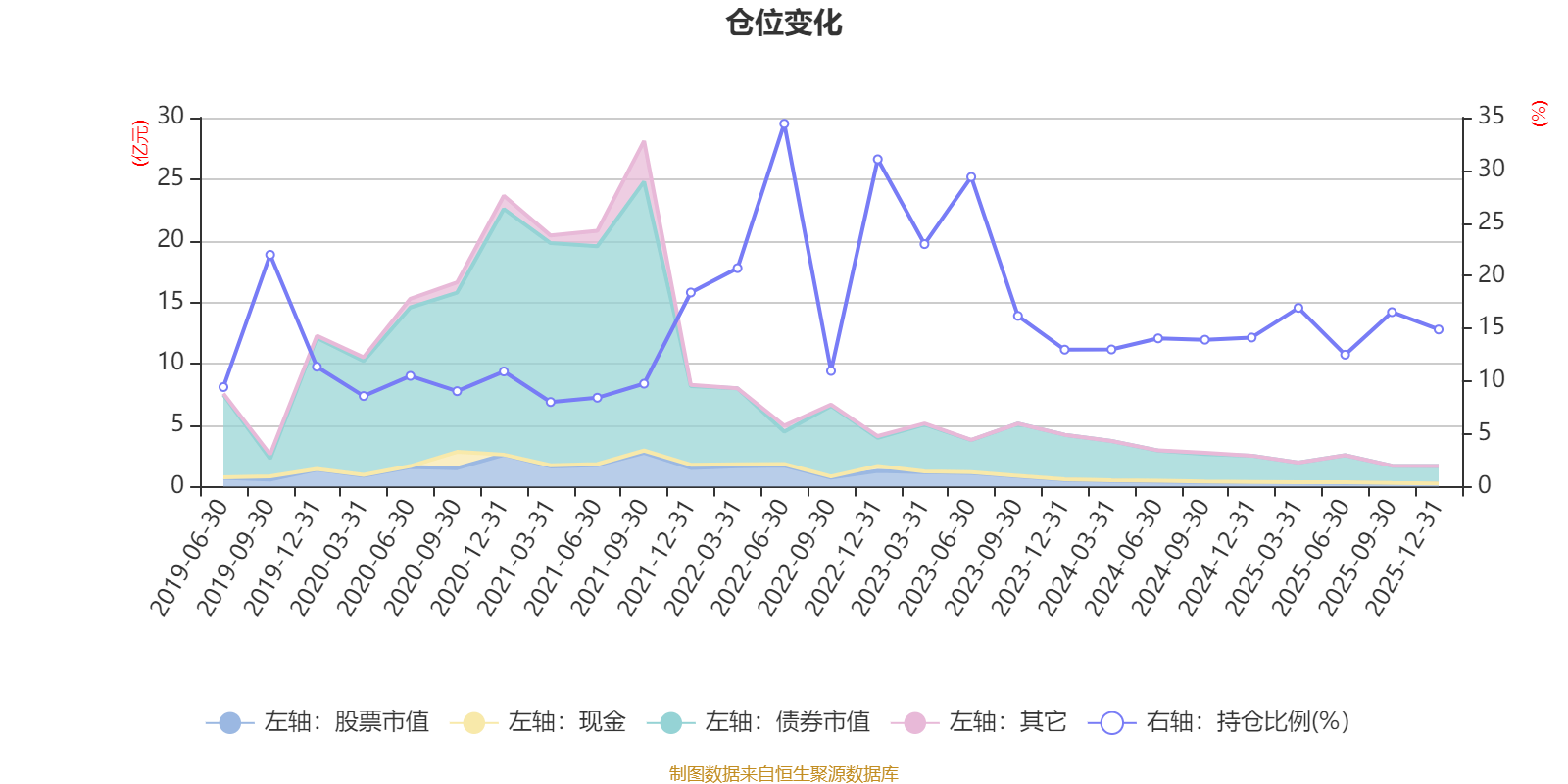 据定期报告数据统计,近三年平均股票仓位为16.47%,同类平均为19.2%。2022年上半年末基金达到34.42%的最高仓位,2021年一季度末最低,为8.02%。