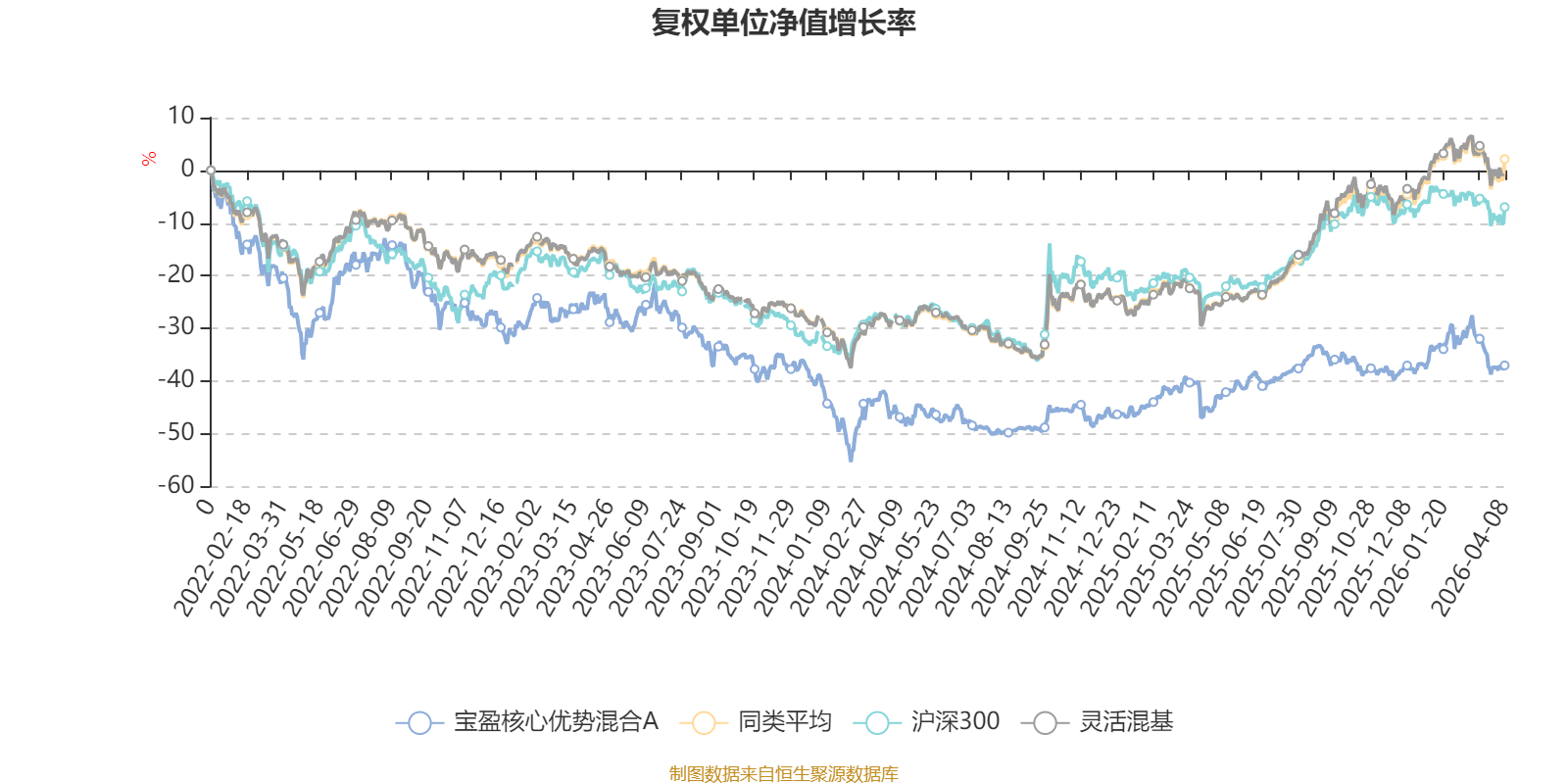 截至4月8日,宝盈核心优势混合A近三个月复权单位净值增长率为-4.08%,位于同类可比基金1027/1287;近半年复权单位净值增长率为-2.52%,位于同类可比基金990/1286;近一年复权单位净值增长率为18.45%,位于同类可比基金921/1286;近三年复权单位净值增长率为-18.16%,位于同类可比基金1192/1286。