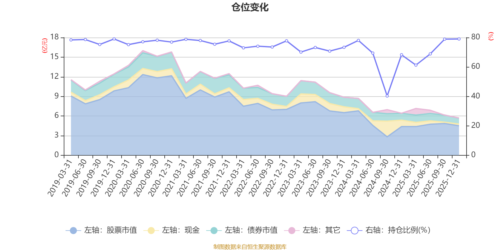 据定期报告数据统计,近三年平均股票仓位为69.27%,同类平均为72.57%。2019年末基金达到79.03%的最高仓位,2024年三季度末最低,为40.25%。