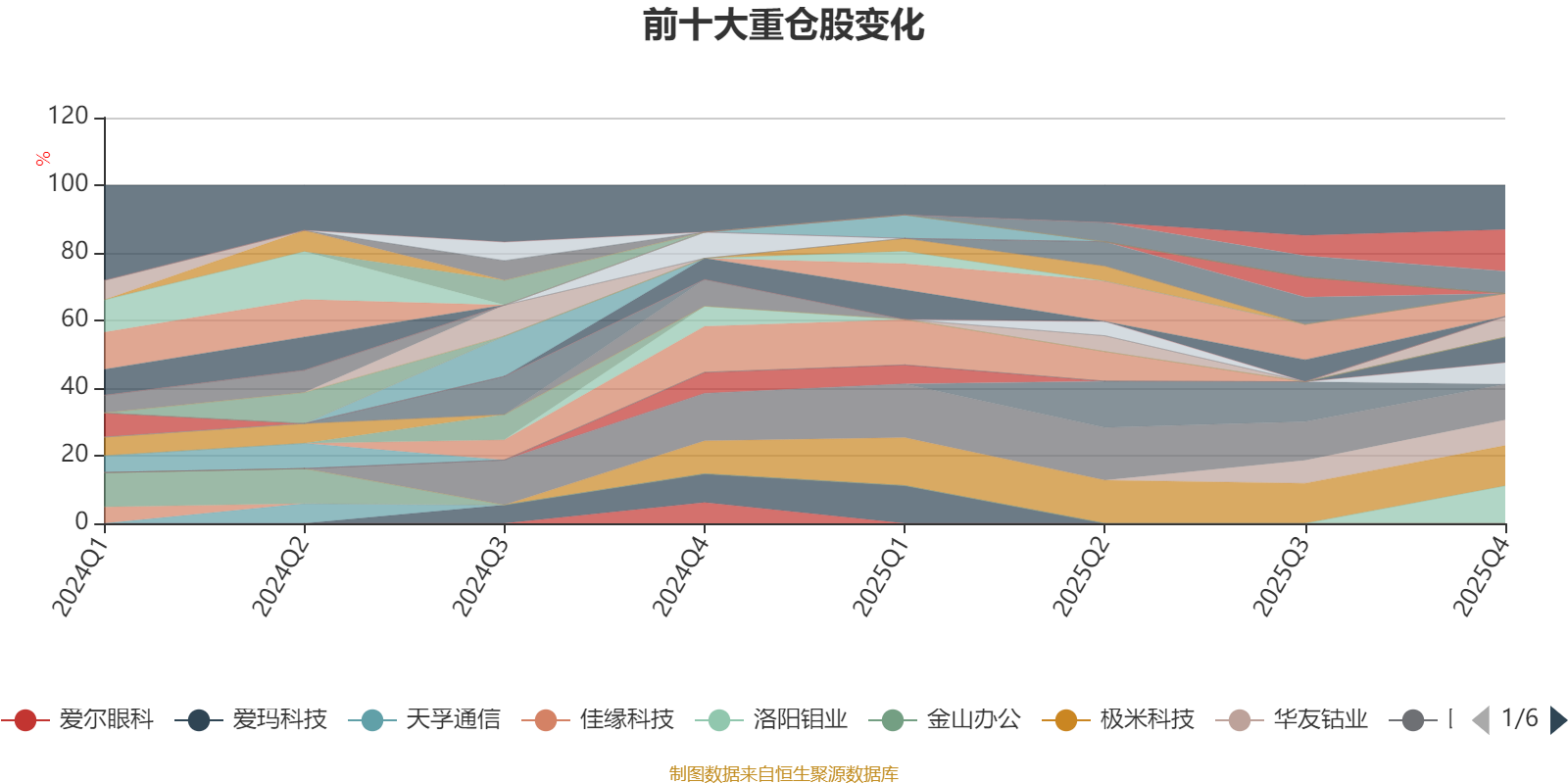 该基金持股集中度较高,近2年前十大重仓股集中度长期超过60%。截至2025年末,基金十大重仓股分别是紫金矿业、极米科技、洛阳钼业、匠心家居、华友钴业、藏格矿业、倍轻松、赛特新材、盛屯矿业、中国平安。
