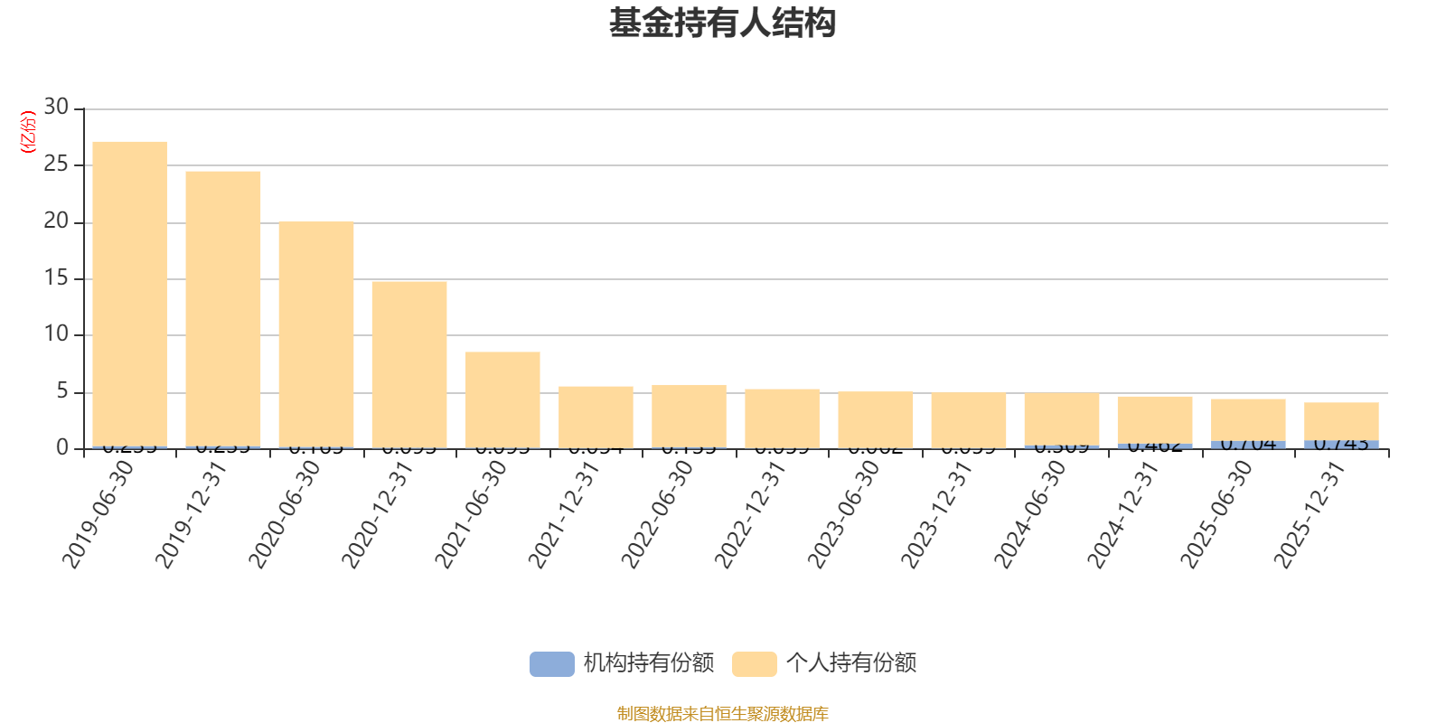 截至2025年12月31日,基金持有人共计1.96万户,合计持有4.08亿份。其中管理人员工持有288.61万份,占比0.71%,机构持有份额占比18.22%,个人投资者占比81.78%。