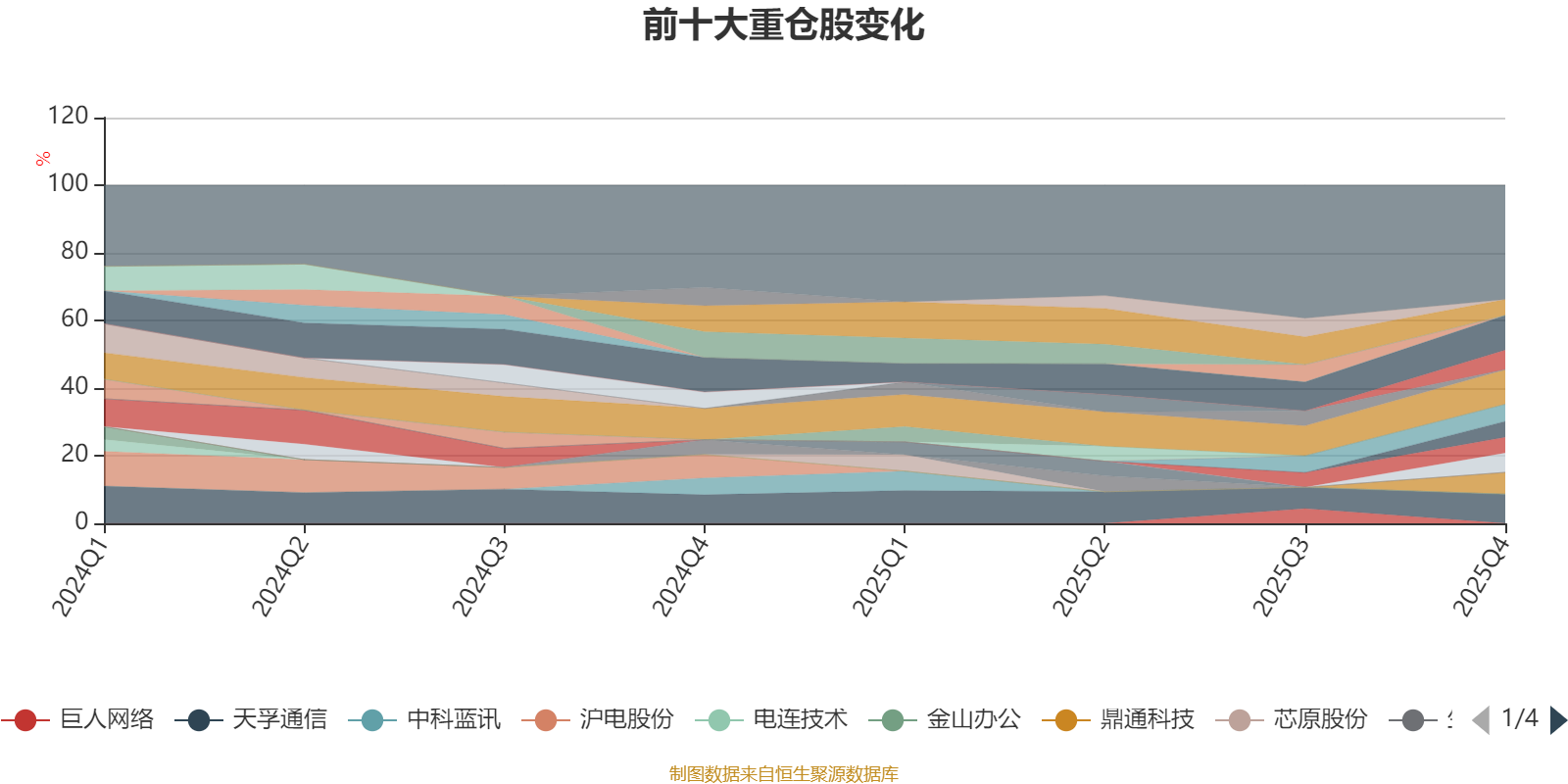 该基金持股集中度较高,近2年前十大重仓股集中度长期超过60%。截至2025年末,基金十大重仓股分别是中际旭创、新易盛、天孚通信、鼎通科技、金盘科技、东山精密、震裕科技、胜宏科技、菲利华、工业富联。