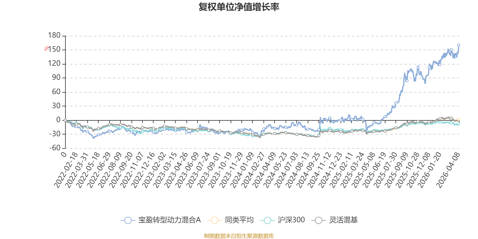 截至4月8日,宝盈转型动力混合A近三个月复权单位净值增长率为18.50%,位于同类可比基金26/1287;近半年复权单位净值增长率为27.38%,位于同类可比基金46/1286;近一年复权单位净值增长率为234.53%,位于同类可比基金5/1286;近三年复权单位净值增长率为217.37%,位于同类可比基金3/1286。