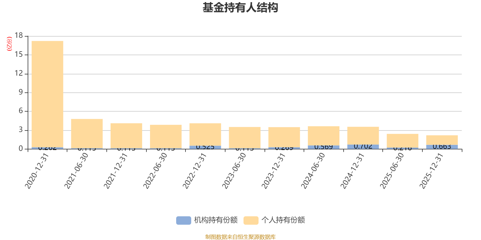截至2025年12月31日,基金持有人共计5671户,合计持有2.17亿份。其中管理人员工持有13.01万份,占比0.06%,机构持有份额占比30.50%,个人投资者占比69.50%。